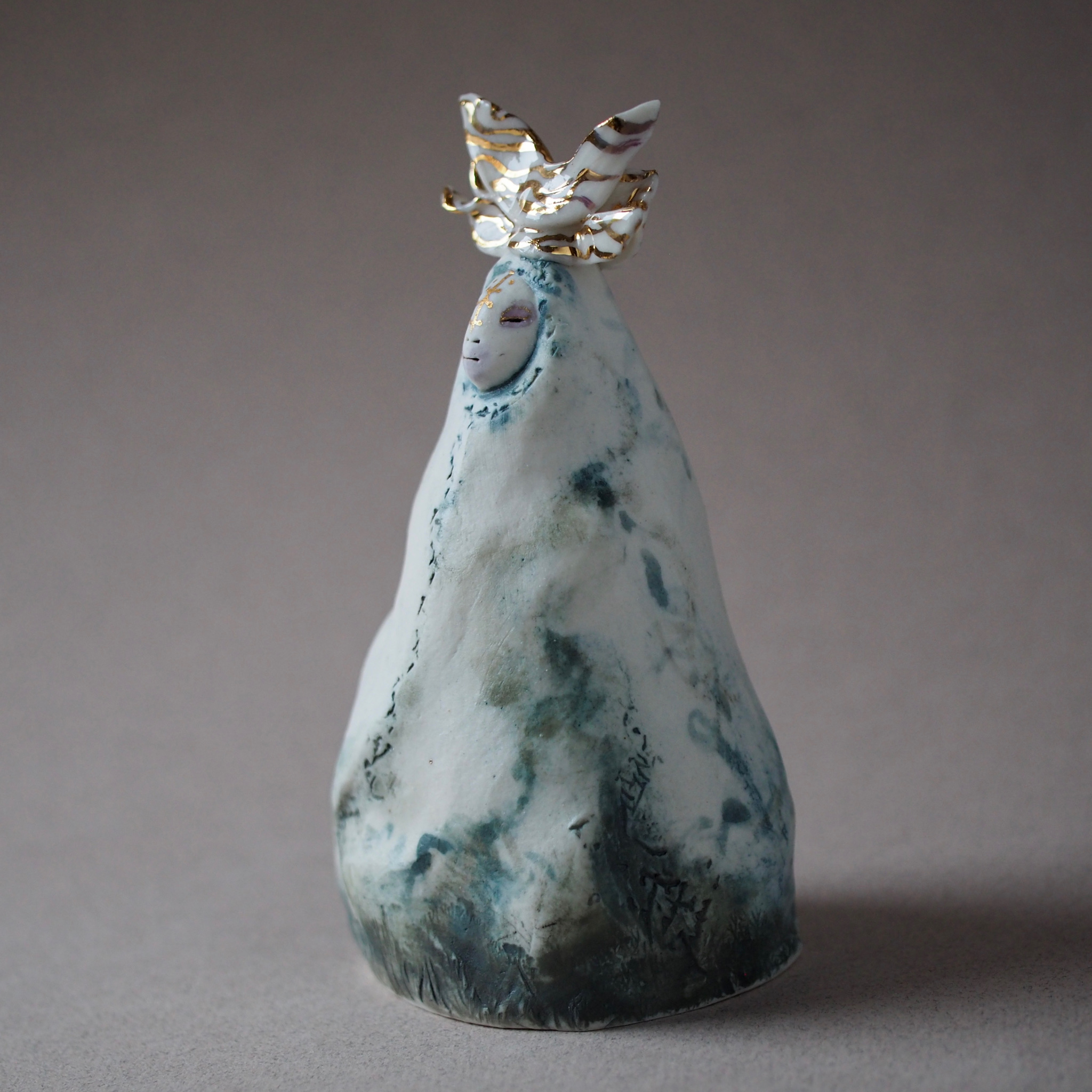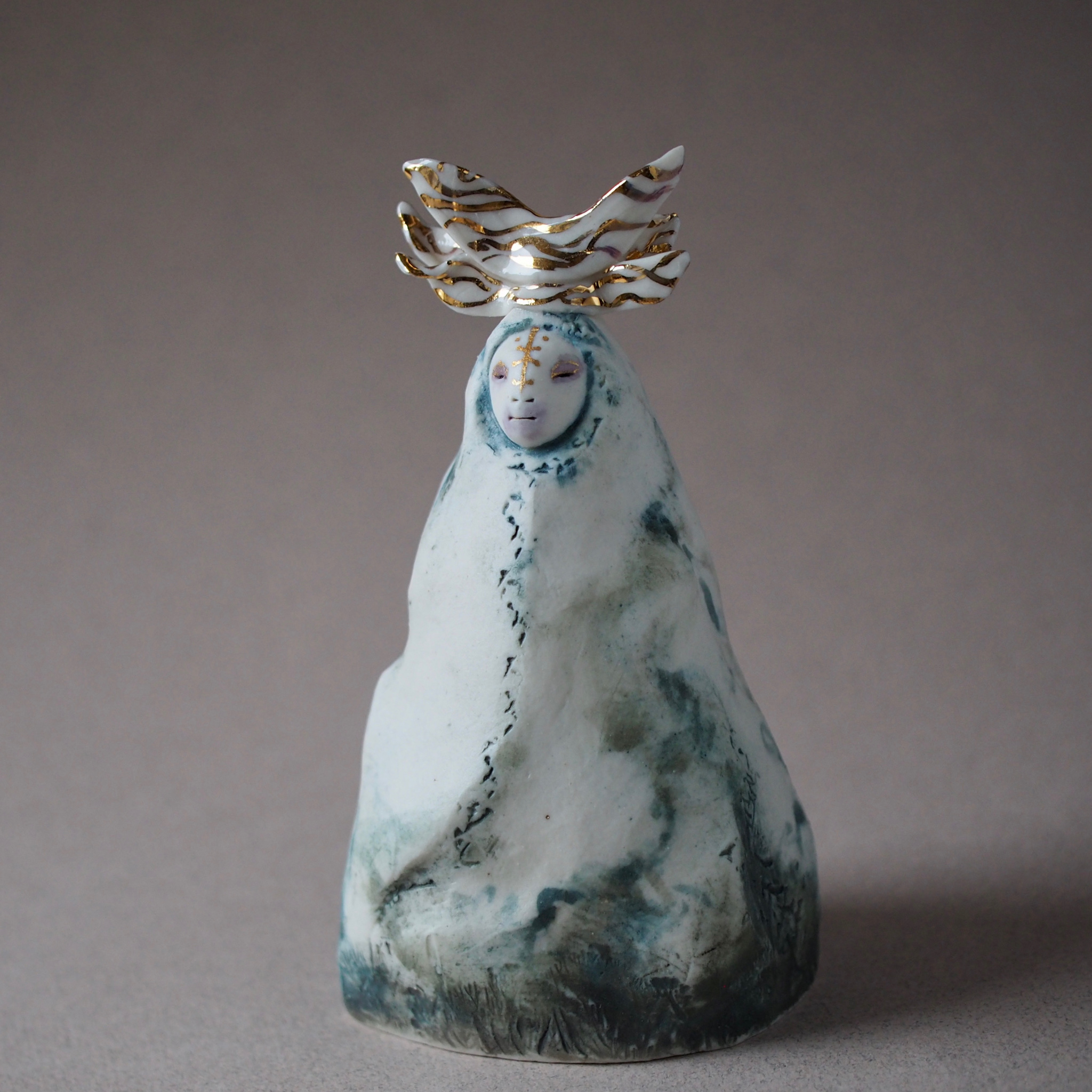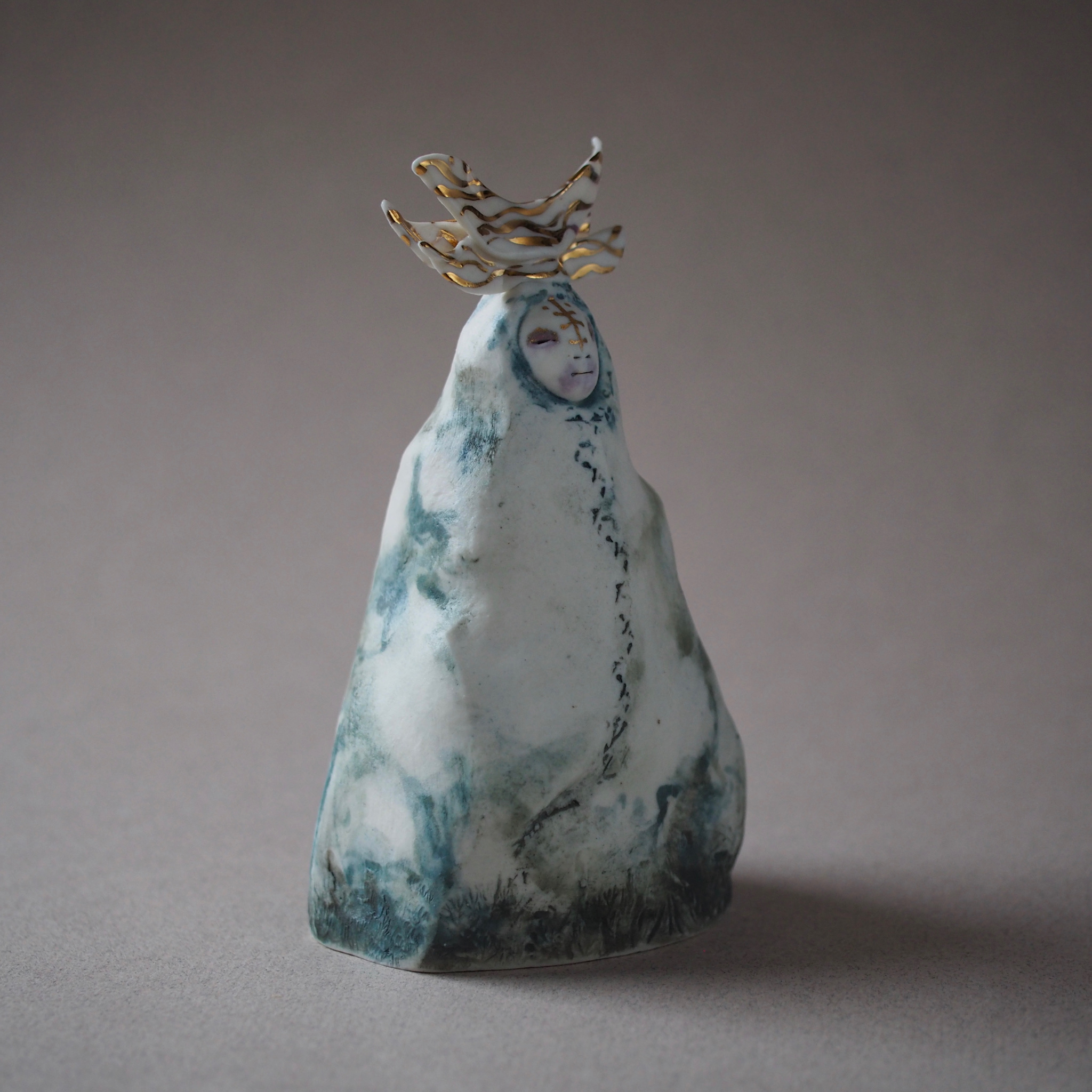 Hand sculpted in porcelain, this little Mountain Deity has a beautiful calming presence. Inviting the night and a feeling that all is at peace. Decorated with underglaze and oxides, glaze and gold lustre.